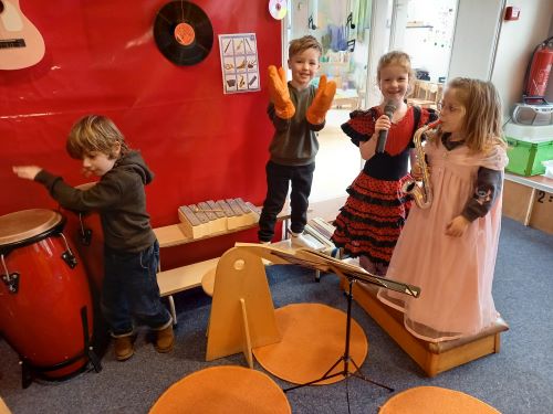 De afgelopen weken heeft muziek centraal gestaan tijdens onze lessen. Zo hebben wij diverse instrumenten besproken en bespeeld zien worden op het digibord en zelf in de muziekhoek uitgeprobeerd. Alle andere lessen zijn ook aangepast aan dit thema, zo hebben we bv bij een rekenles in een grafiek kunnen aflezen welk instrument de favoriet is van de kinderen in de klas, boeken over muziek gelezen, veel gezongen, muziekinstrumenten gemaakt, ritmes geklapt met onze klap wanten en natuurlijk gespeeld in onze muziekhoek.